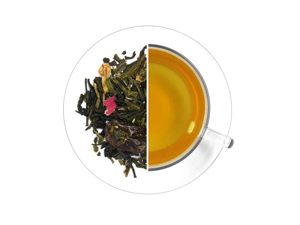 Pravý zelený čaj Sencha a China Jasmin s květy s příjemnou chutí ostružin v kombinaci s chutí jasmínu.