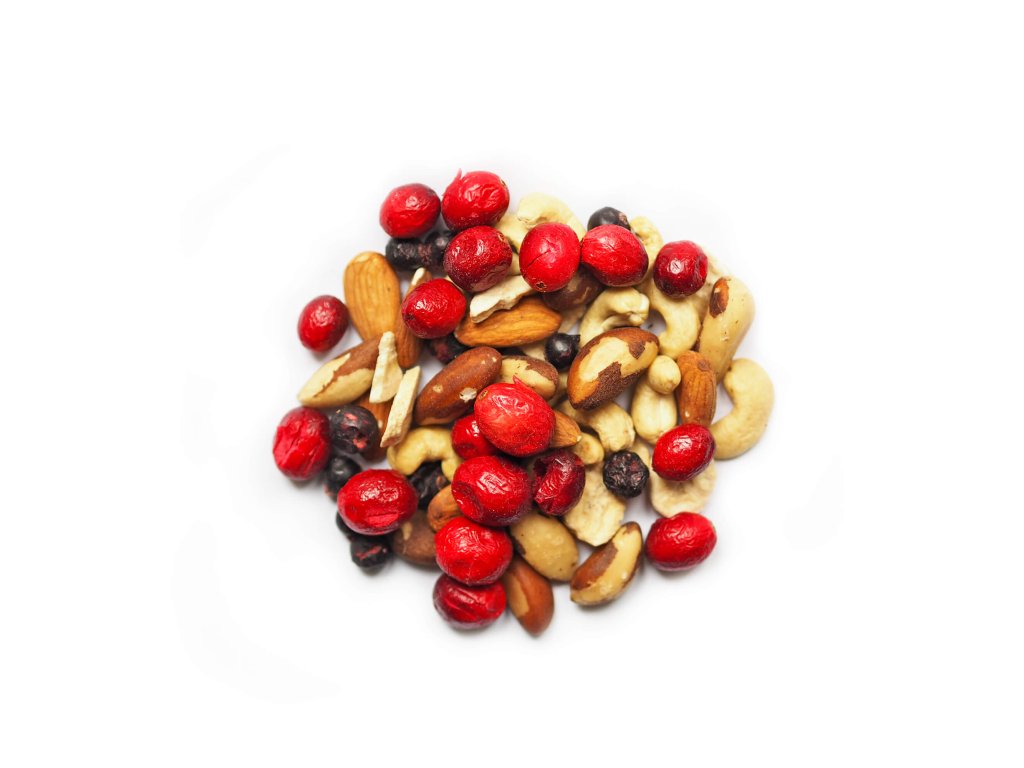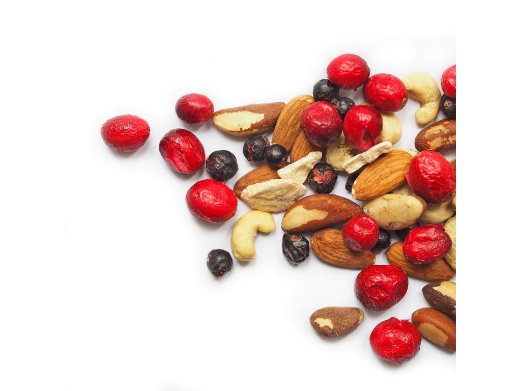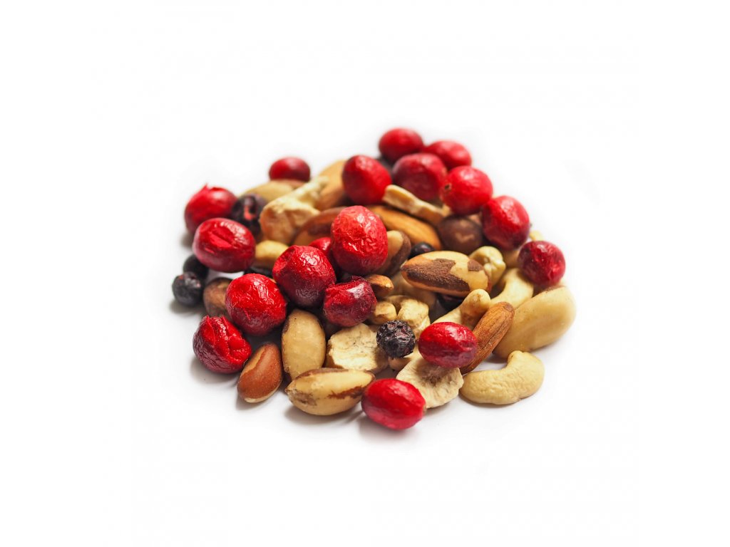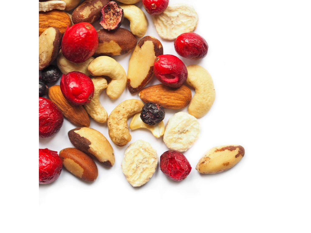 Složení:: | kešu ořechy (27,78 %), mandle natural (27,78 %), para ořechy (27,78 %), banán lyofilizovaný (5,56 %), černý rybíz lyofilizovaný (5,55 %),klikva velkoplodá lyofilizovaná (5,55 %) |