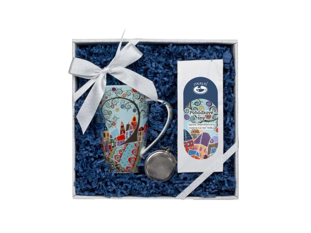 Exlusivní dárkové balení obsahující : hrnek VESNICE 0,6 l + ovocný čaj Pohádkové sny- aromatizovaný čaj bez ibišku, 50 g + nerezové sítko na čaj. Vše zabaleno v dárkové krabici.
