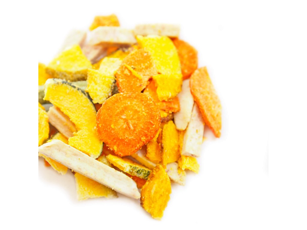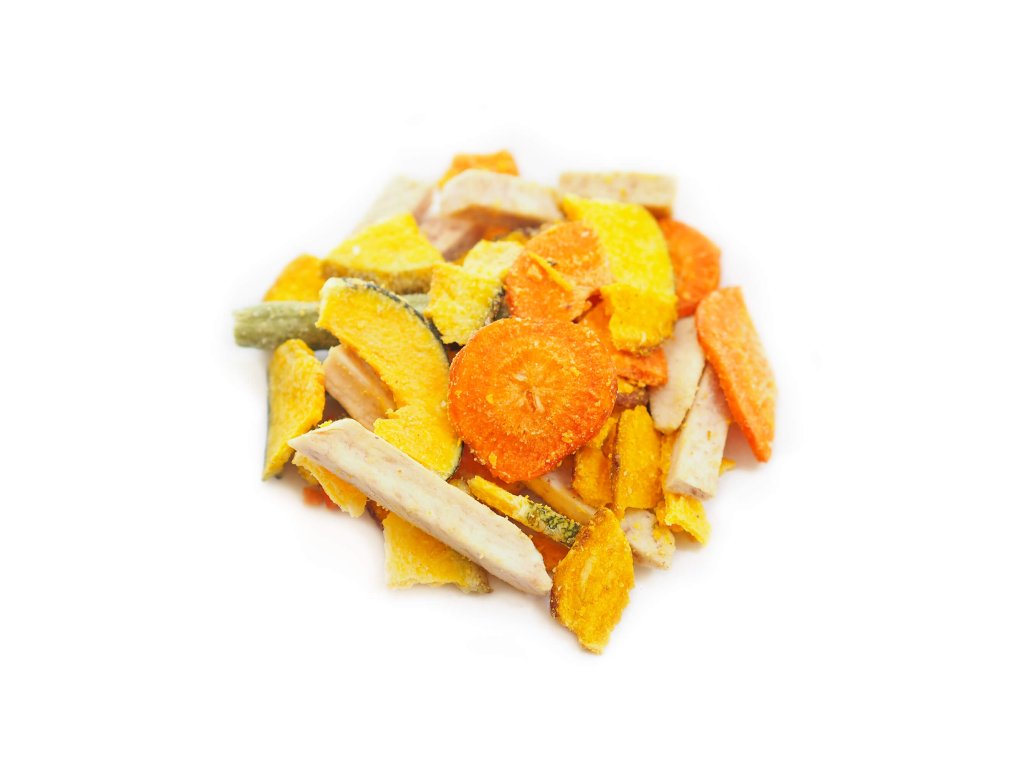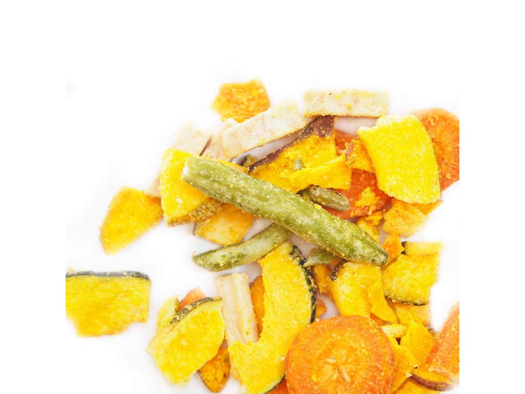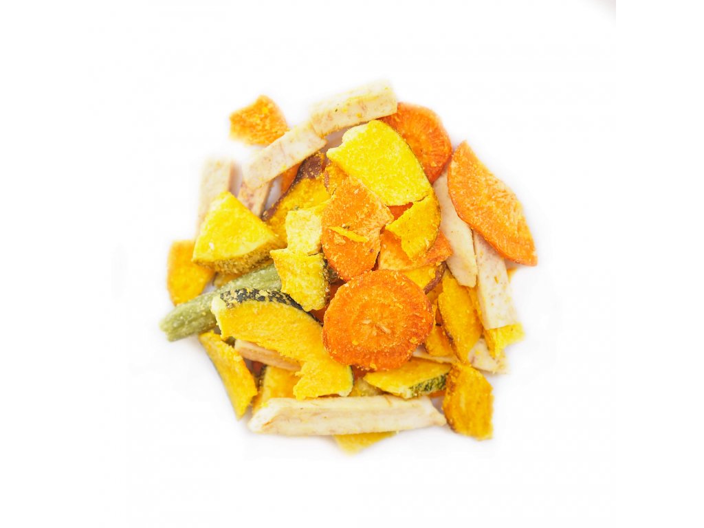 Složení: | sladké brambory (batáty) 29,2%, cuketa 20,9%, taro 12,5%, mrkev 12,5%, palmový olej 12%, zelené fazolky 8,4%, dextrin 4%, sůl 0,5% |